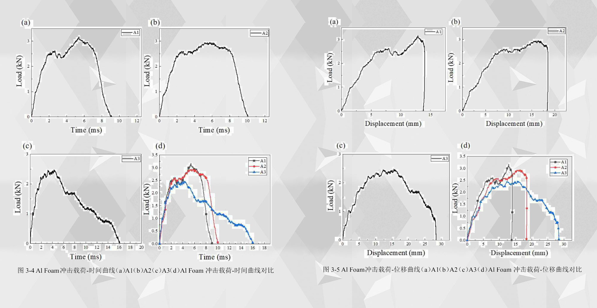 3-4所示為Al Foam板在30J40J50J落錘沖擊能量下的載荷-時間曲線圖。 從圖中可以看出,Al Foam板在落錘沖擊荷載下的載荷-時間曲線分為三個階段。在第一個階段,在沖擊作用下,荷載隨著時間而呈現直線上升趨勢,三種沖擊能量下的載荷-位移曲線圖的第一階段斜率都很接近。在第二個階段,曲線開始波動上升,直到上升到載荷的最大值。A1的沖擊峰值載荷為3170NA2的沖擊峰值載荷為2957NA3的沖擊峰值載荷為2475N,從沖擊峰值載荷可以看出,沖擊能量為30J40J時,其沖擊峰值能量相近,這是由于沖頭未能穿透Al Foam板 ,Al Foam板的自身強度使得沖擊載荷維持在較高水平,而在沖擊能量為50J時,高沖擊能量下沖頭已經穿透了Al Foam板,Al Foam板的沖擊中心區域已經破壞,所以其沖擊峰值能量較低。在第三個階段,沖擊荷載開始隨著時間下降,A1A2的載荷下降速度快于A3,這是由于A1A2未能擊穿Al Foam板,沖頭在沖擊過程中停止較快,而A3由于沖頭在沖擊過程中穿透了Al Foam板,所以其載荷下降速度較慢。