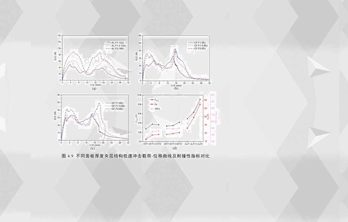 為了研究夾層結(jié)構(gòu)的面板厚度對(duì)沖擊性能的影響,圖4.9(a)-(c)比較了三種不同面板厚度的夾層結(jié)構(gòu)的載荷-位移曲線。無(wú)論是彈塑性面板還是脆性面板,夾層結(jié)構(gòu)的面板厚度對(duì)其低速?zèng)_擊響應(yīng)均有較大影響。為了更直觀地比較,圖4.9(d)對(duì)比了不同面板厚度夾層結(jié)構(gòu)的耐撞性指標(biāo),通過(guò)觀察,鋁合金夾層結(jié)構(gòu)的耐撞性能隨面板厚度增加而明顯增加,面板厚度從1mm增加到2mm,其初始峰值載荷、穿透吸能和比穿透吸能分別提高了84%、108%和54%;對(duì)玻璃纖維夾層結(jié)構(gòu)而言,當(dāng)面板厚度從1mm增加到2mm,其初始峰值載荷和穿透吸能分別只提高了24%和13%,而面板厚度的增加對(duì)比穿透吸能的影響效果差異不大;而對(duì)碳纖維夾層結(jié)構(gòu)而言,當(dāng)面板厚度從1mm增加到2mm,其穿透吸能和比穿透能分別提高了42%和33%,并且隨著層數(shù)的增加,耐撞性指標(biāo)增加的幅度大幅減小。